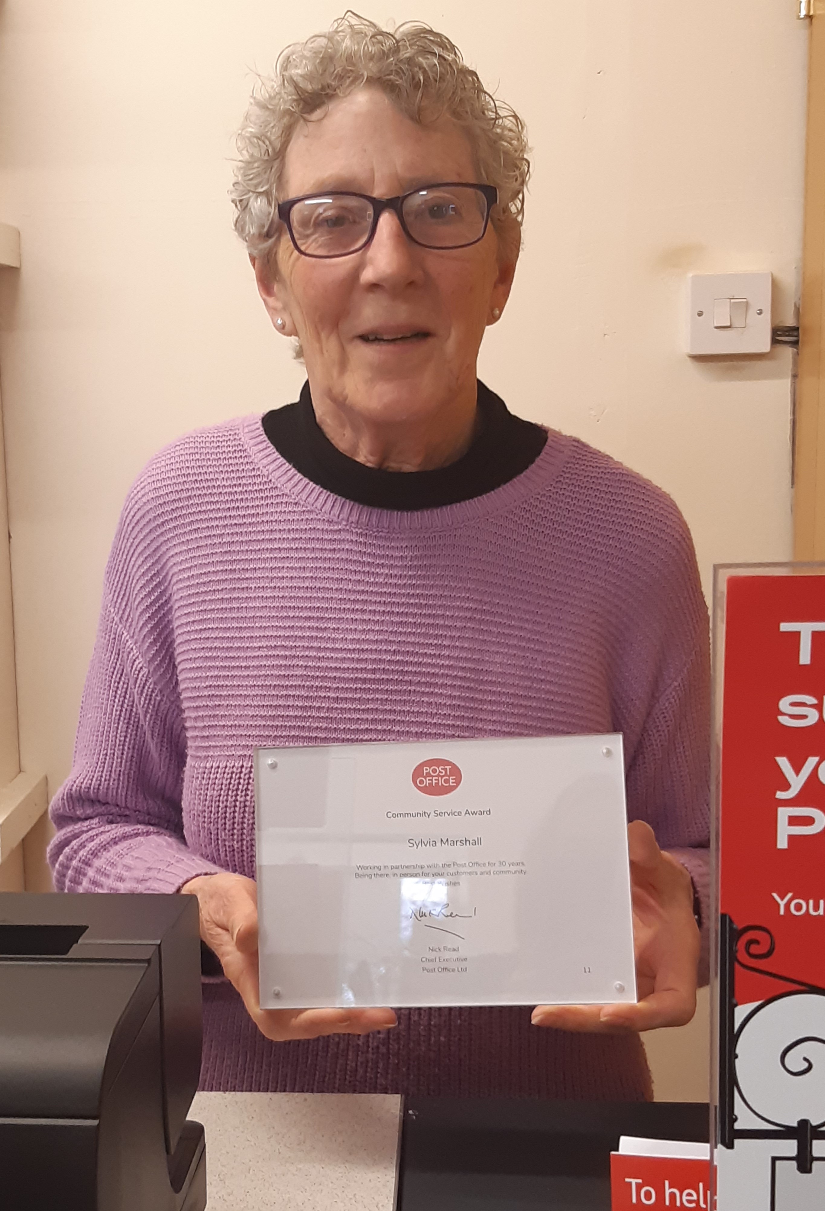 A Post Office 30 Years’ Long Service Award has been presented to Sylvia in appreciation of her important role in the community.