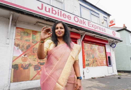 Branch Manager Vasanthi Balachandar is pictured for the national launch with the beautiful new coin at Jubilee Oak Post Office and Jubilee Oak Express convenience store at Cressing Road. In 1887 the Jubilee Oak was planted very close to this store to celebrate the Golden Jubilee of Queen Victoria. There had been a band and a crowd of several hundred people gathered to mark the occasion.